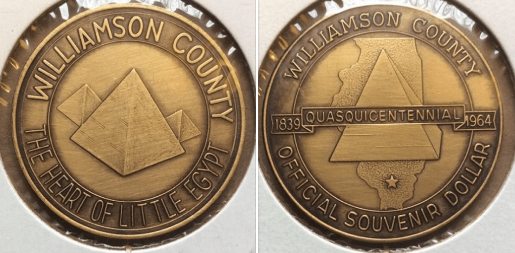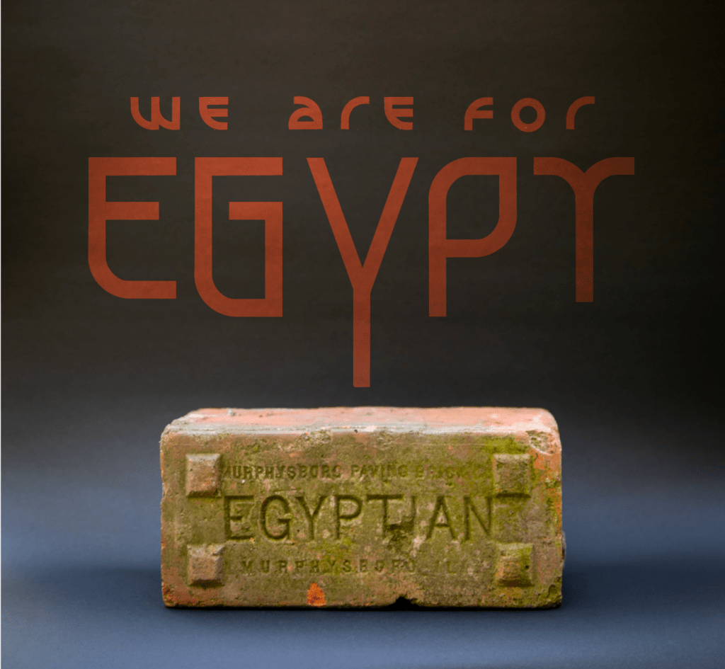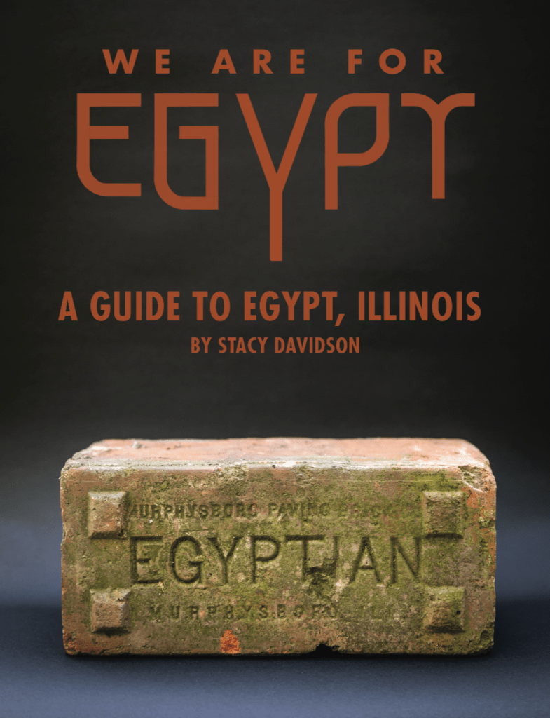 About the cover design: I did not want to include an overtly Egyptian cover image like a detail from the Sentinel Building in Centralia, Illinois, or an obelisk or pyramid. I met with my Producer Jenny Pape in downtown Carbondale, and, as I was leaving, I looked down and saw that the brick-lined streets included several bricks stamped “Egyptian.” There were variations in the designs, condition, and accompanying text, but here was an emblem representing this underlying “Egyptian” identity—right under my feet! The bricks were made in the early 20th century by the Murphysboro Paving Brick Company, and you can still see them lining old brick streets or being used as paving stones or decorative elements—providing a foundation, if you will, that still supports the region. After explaining this concept and what I was looking for, Jen Haselhorst and Nate Graham were able to make this vision a cover photo reality.