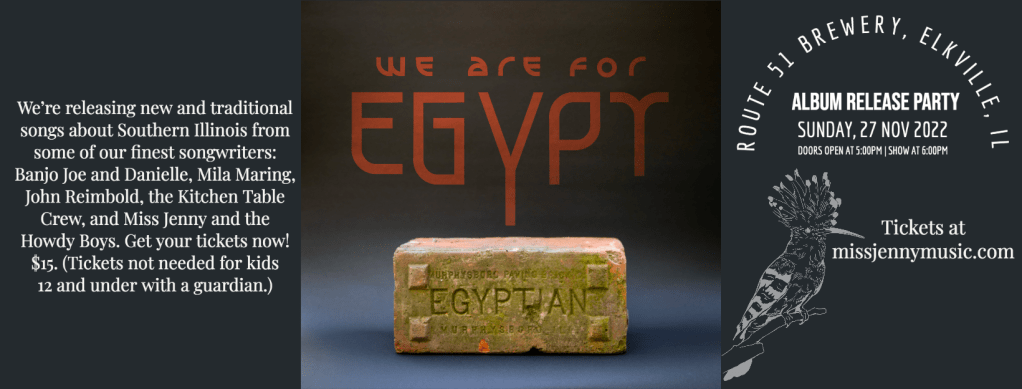 We are pleased to announce that the We Are For Egypt album will have an in-person launch! Join us on Sunday, 27 November 2022, at Route 51 Brewery, 18967 N US Hwy 51, Elkville, IL 62932. We’re releasing new and traditional songs about Southern Illinois from some of our finest songwriters: Banjo Joe and Danielle, Mila Maring, John Reimbold, the Kitchen Table Crew, and Miss Jenny and the Howdy Boys. Get your tickets now at missjennymusic.com! $15. Doors open at 5pm. Show starts at 6pm. Tickets not needed for kids 12 and under (but must be accompanied by a guardian).