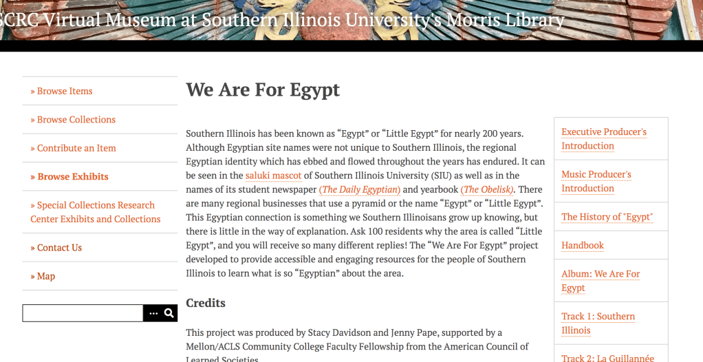 The “We Are For Egypt” Digital Exhibit is accessible through the SCRC Virtual Museum at Southern Illinois University’s Morris Library. Watch videos and read commentary on each of the songs from Project Creator Stacy Davidson and Album Producer Jenny Pape. The lyrics to each song are available as are links to listen to the album online. Many thanks to Dr. Anne Marie Hamilton-Brehm for formatting the online exhibit.